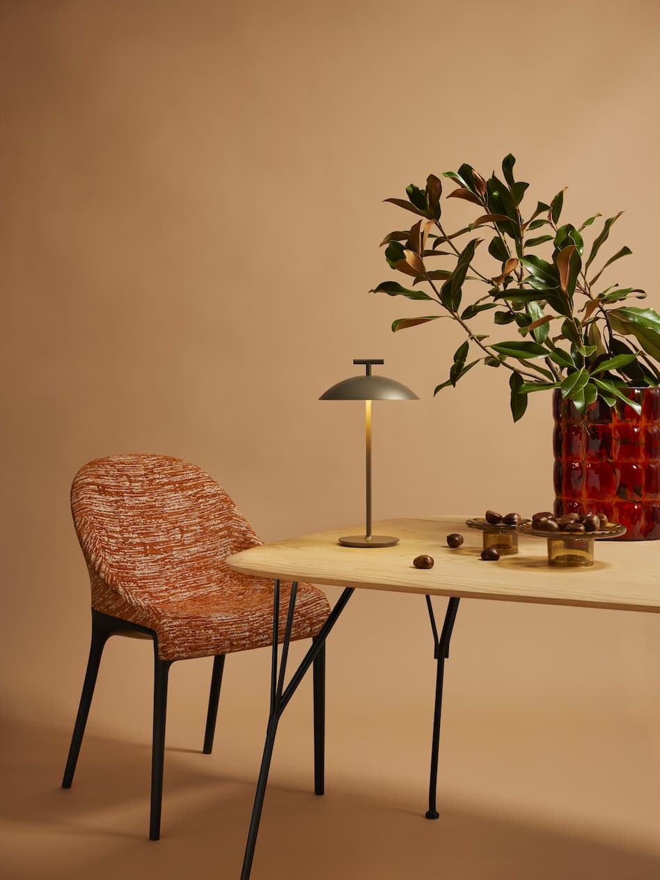Fotel to opowieść o elegancji i dyskretnym uroku. Philippe Starck na nowo przemyślał zasadnicze linie włoskiego stylu z ponadczasowym fotelem, który łączy świat Haute Couture z bon ton. Cechy charakterystyczne: wyrafinowanie i dyskrecja, miękkość i płynność. Ten tapicerowany fotel występuje w dwóch wersjach, ELEGANZA NIA i ELEGANZA ELA. Obydwie mają płynne i lekkie formy, w których główną rolę gra tkanina – czy to mélange, czy sztuczna skóra – delikatnie pokrywająca linie fotela.