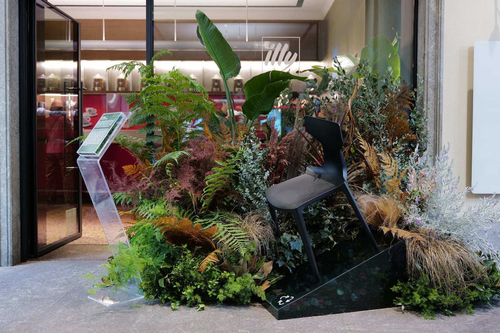 Partnerstwo między Kartell a illycaffè będzie również głównym tematem instalacji, która podczas Tygodnia Designu w Mediolanie ożywi flagowy sklep illy na Via Montenapoleone (Mediolan), motywem przewodnim są natura i zrównoważony rozwój: bogata roślinność rozprzestrzeni się spontanicznie we wszystkich swoich przestrzeniach, witając krzesła Re-Chair, aby ożywić doskonałą spójność i współistnienie wszystkich elementów bez skażenia natury i zieleni. Na niektórych wyspach roślinności zostaną połączone zielone plexi zawierające kapsułki z kawą, aby podkreślić proces produkcji krzesła. Sposób, również malowniczy, na podkreślenie, w jaki sposób dwie doskonałości Made in Italy przyczyniają się do zrównoważonego rozwoju planety poprzez wzmocnienie modeli produkcji w gospodarce o obiegu zamkniętym. Z okazji Salone del Mobile przestrzeń restauracyjna zostanie wyposażona w krzesła Re-Chair i Eleganza.
